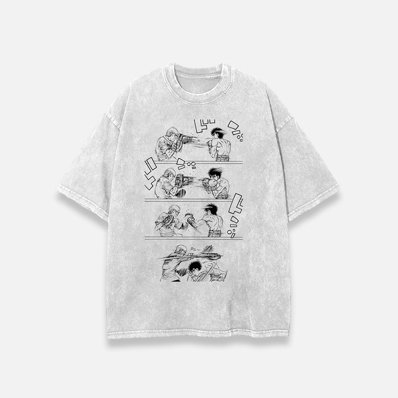 This T-shirt features a dynamic illustration of Ippo, the hero of the manga Hajime no Ippo, in the midst of training. Every detail of this design celebrates the determination and fighting spirit that define true boxers.