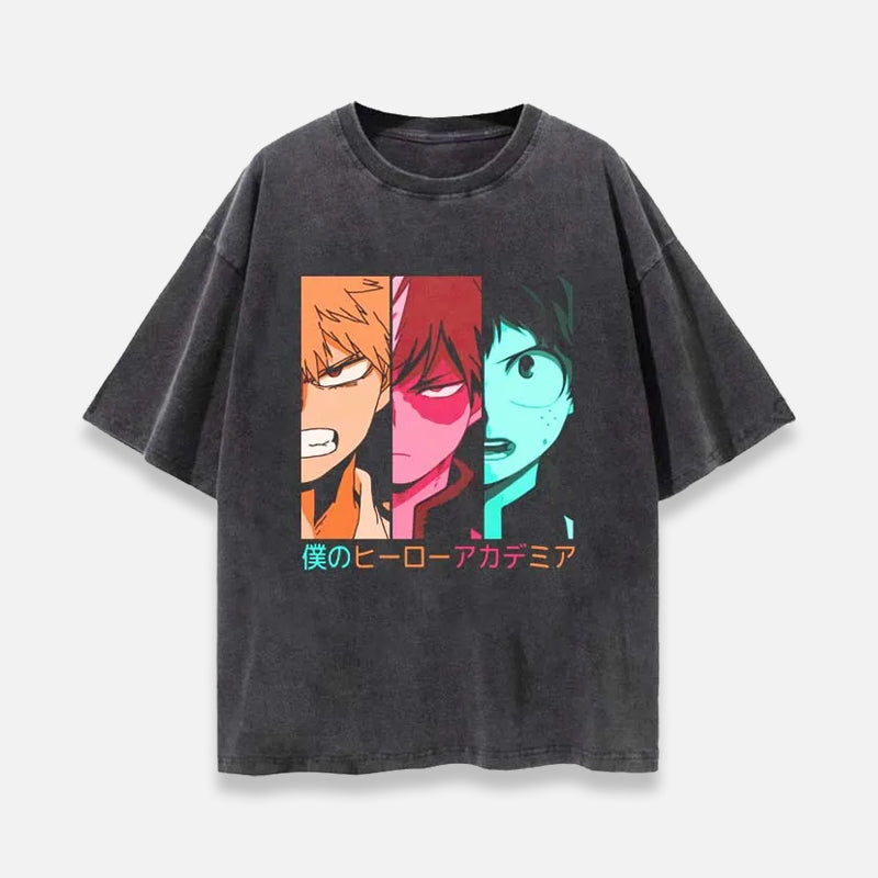 This t-shirt highlights Bakugo on the left, Shoto in the center, and Deku on the right, forming a formidable team ready to face any challenge. Perfect for fans who admire the intense rivalry and the camaraderie of these rising heroes.
