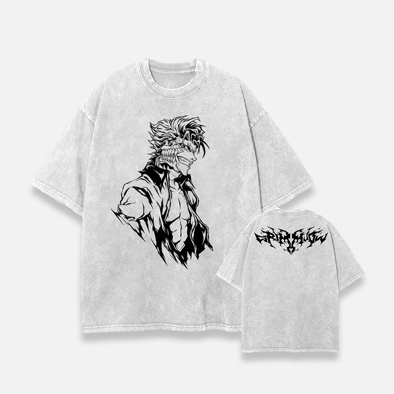This t-shirt pays tribute to Grimmjow Jaegerjaquez, the fearsome Espada, known for his charisma and strength. With a striking graphic design representing his charisma and displaying the remains of his mask from when he was still a hollow!