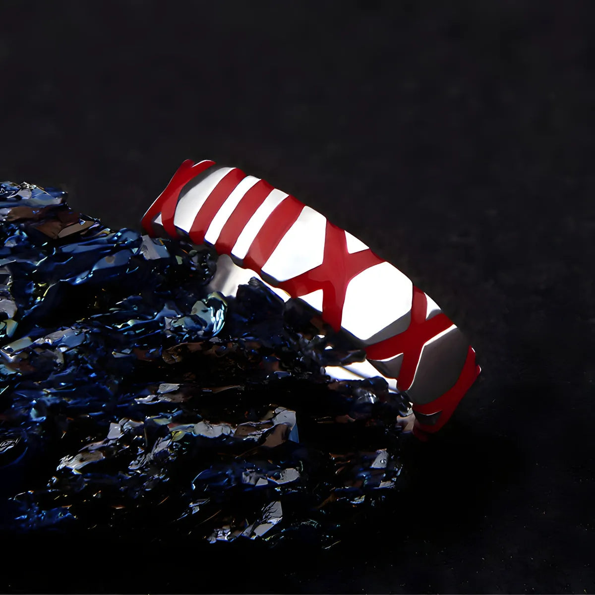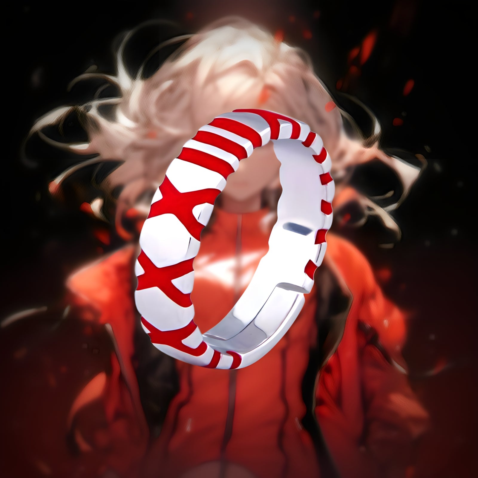 This silver ring captures the essence of the character through its design, featuring the iconic red threads that run across his body—symbols of his troubled past under Big Madam and his unbreakable determination.